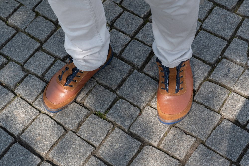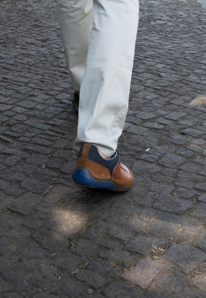 För AQIV använder vi olika material för att bilda en snygg look å ena sidan och för att uppnå bästa möjliga funktionalitet å andra sidan. Det mjuka, perforerade nappa -läderet i det främre området säkerställer hög andningsaktivitet och är särskilt flexibel och gosig. Som förstärkningar fodrade vi barfotskon med robust mocka i brunt. Vi använder också Velor Leather vid ingången för att ha god stabilitet i detta område. Den mjuka stoppningen säkerställer att axeln kramar din fot underbart.