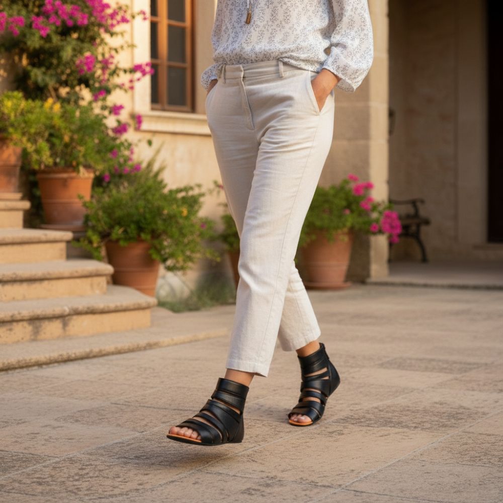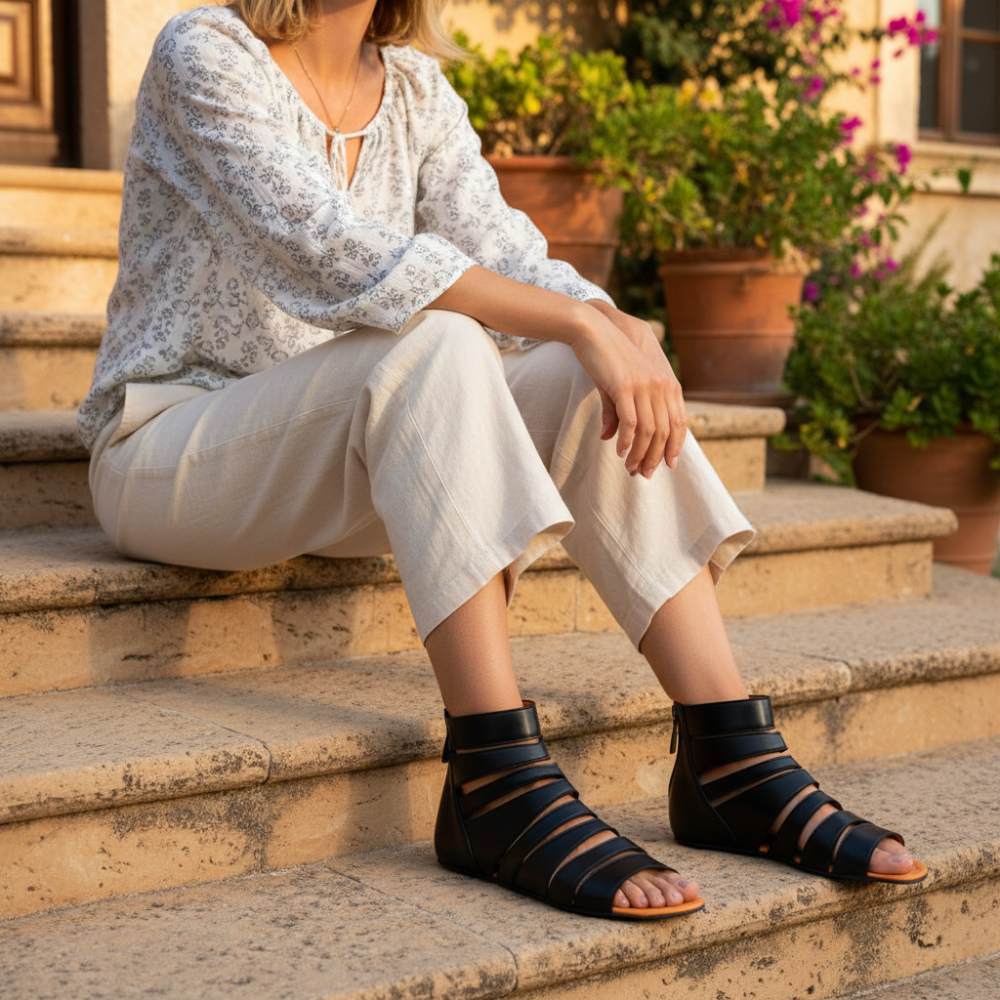 Denna eleganta barfota sandal gladiq svart gjord av svart nappa läder och med snygga remmar är en speciell ögon -catcher och mycket bekväm. För en enkel inträde och ett fast håll har denna sandal i ankelområdet ett subtilt elastiskt band utöver zip som fästs på baksidan.