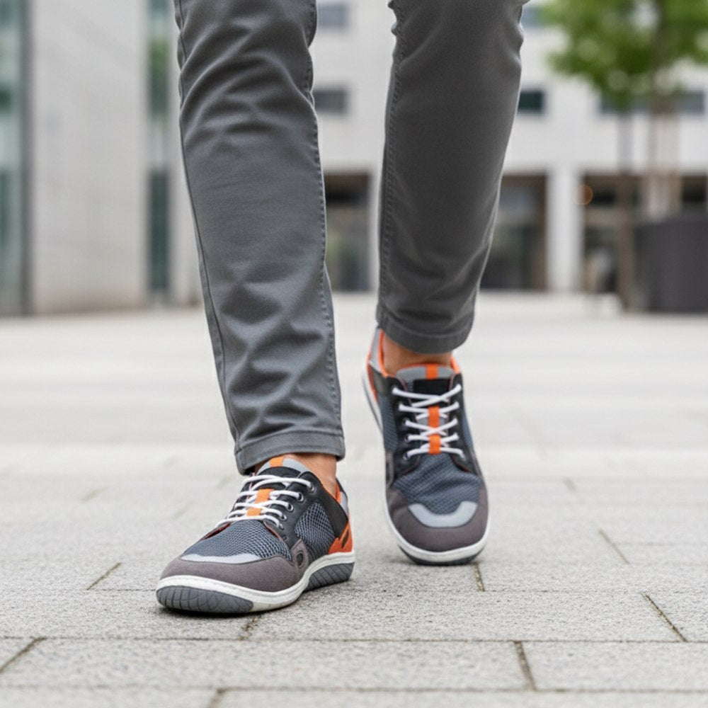 Den subtila gråa bildar en fin kontrast med den slående orange tonen och ser därmed modern ut. Öppen -pormaskvävnad används som huvudmaterial, som förstärktes av robust mikrofiber i de känsliga områdena.