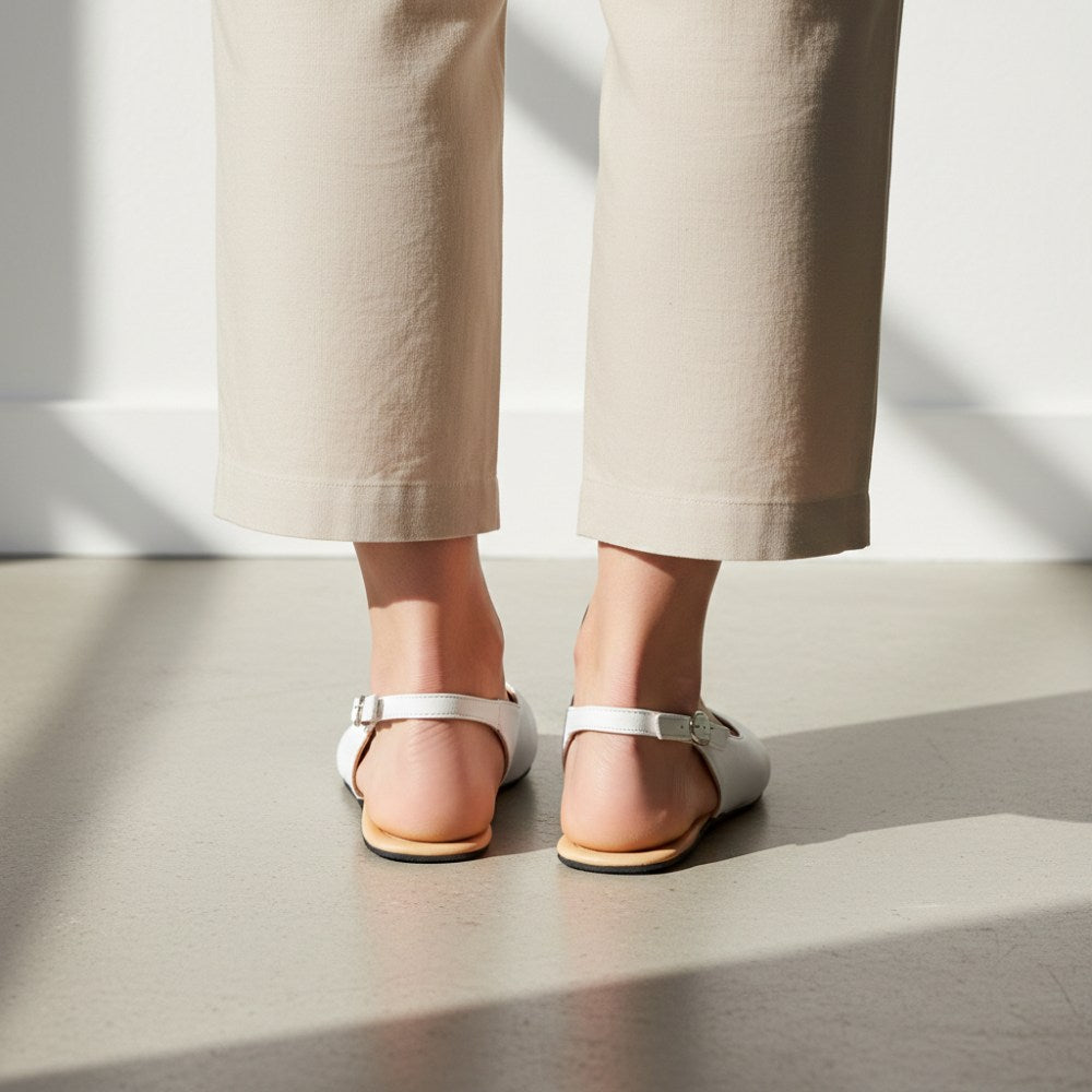 Barefoot -skon är stängd framför tåområdet och öppnas på baksidan av klackarna. Detta ser otroligt elegant ut. Du kan justera remmen perfekt till dina individuella behov via det subtila spännet för att få det perfekta greppet i ballerina.