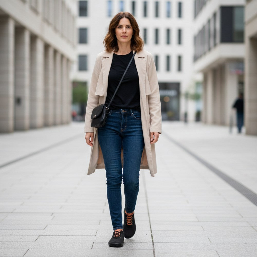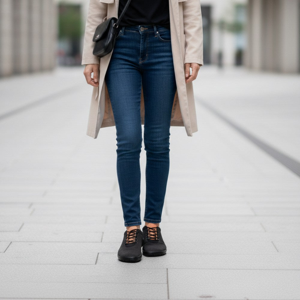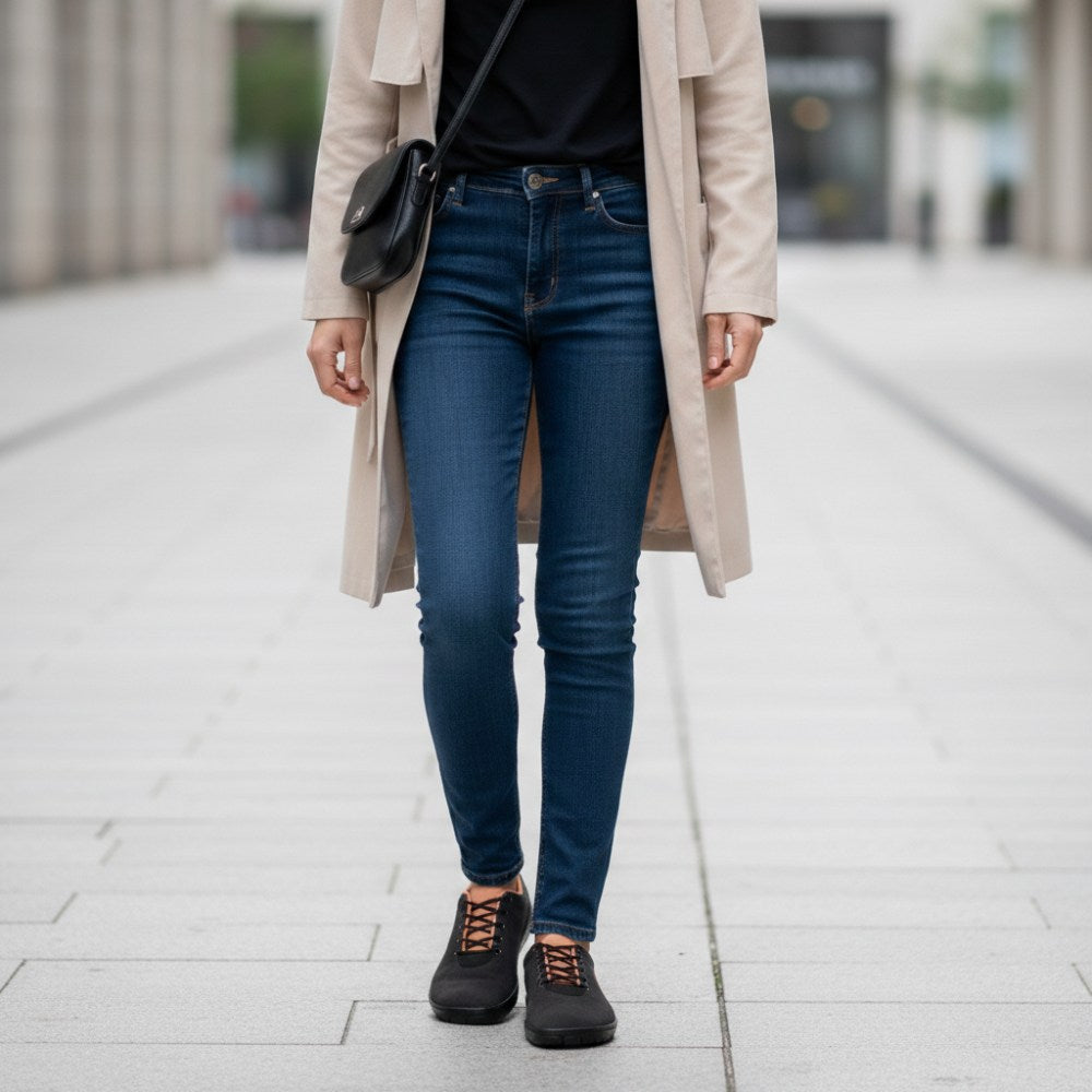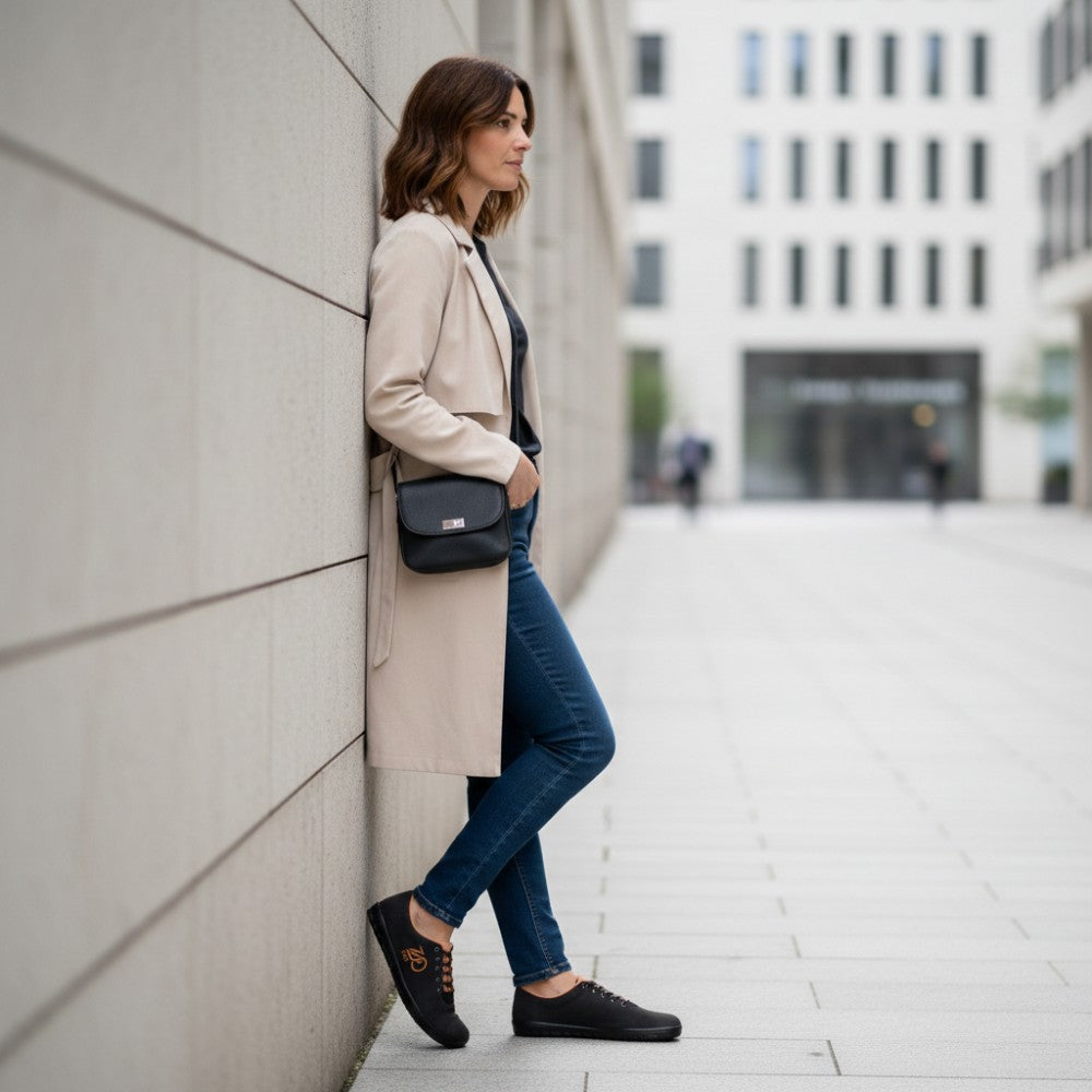 Qaro Black Orange är den perfekta följeslagaren för jeans. Med sina orange accenter är denna vegan barfota sneaker något mycket speciellt utan att dansa för mycket ur linjen.