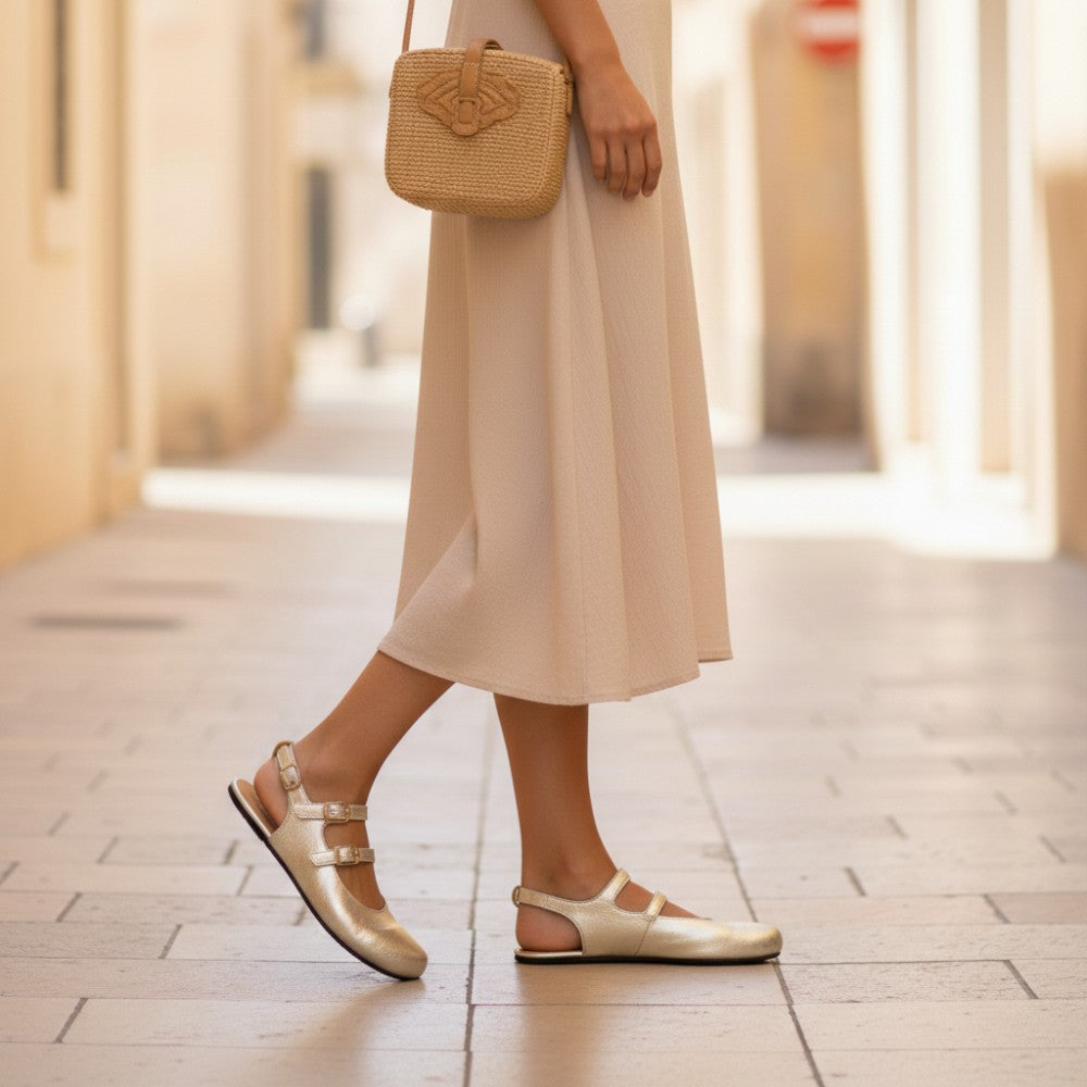 Vårt Qomeet -guld kombinerar glamour och komfort i en öppet skuren ballerinsko. Med de justerbara remmarna ovanför klämman och den extra remmen på baksidan erbjuder vårt Qomeet Gold en perfekt passform och ett säkert grepp med varje steg.