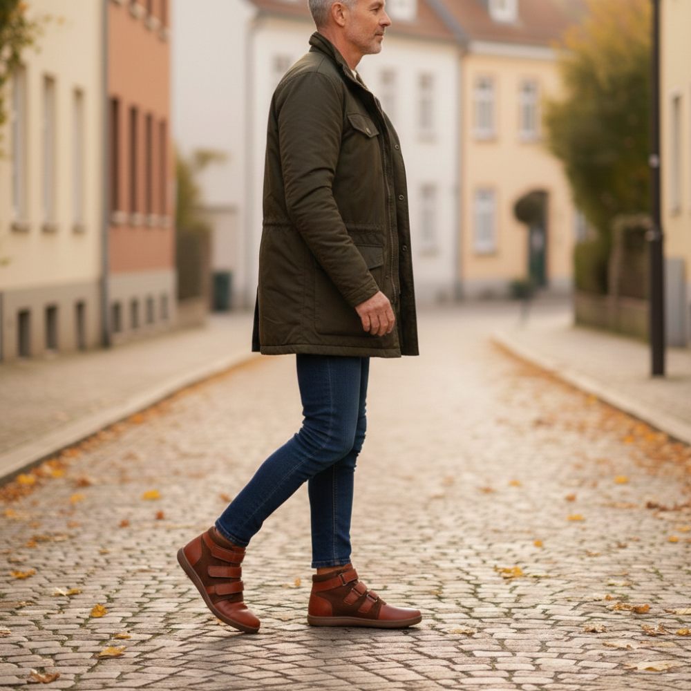 Qoope består av Cognac -färgade premium Nappa -läder, som stoppas i kardborrfästet och på axeln med mörkbrun mocka. Barefoot -skon känns bara otroligt bra när du bär. Materialet ligger perfekt dina fötter, det breda snittet säkerställer frihet och den flexibla sulan ger dig den ultimata känslan av barfota.