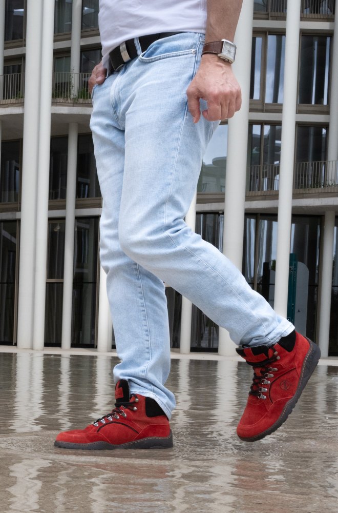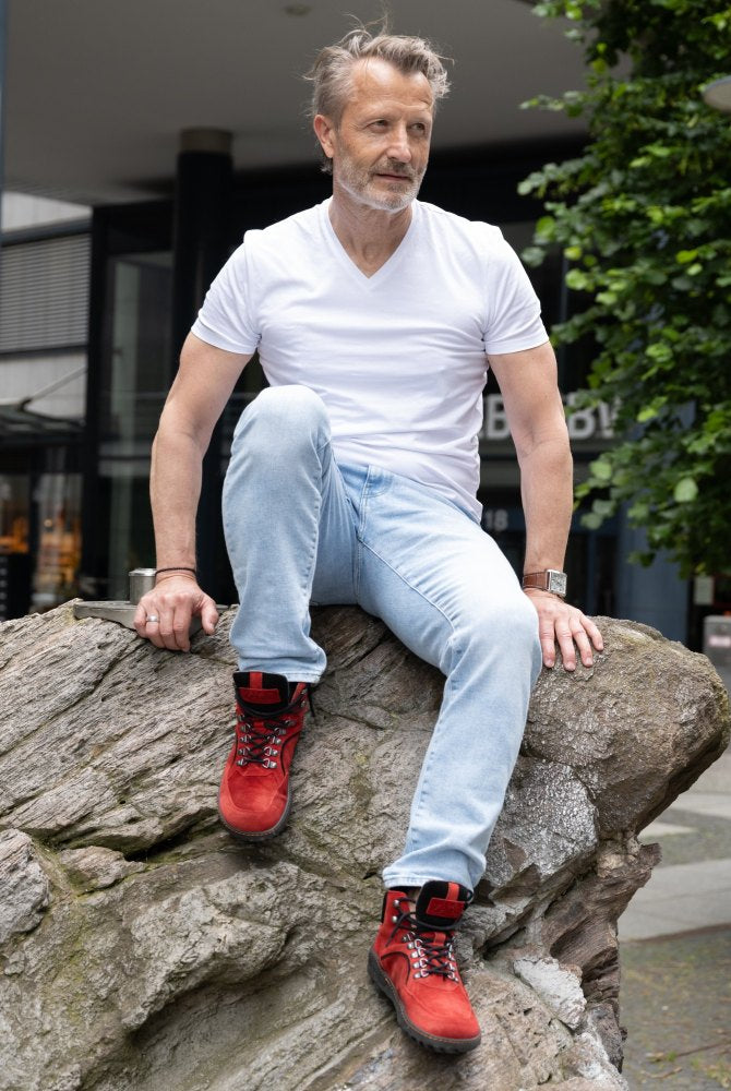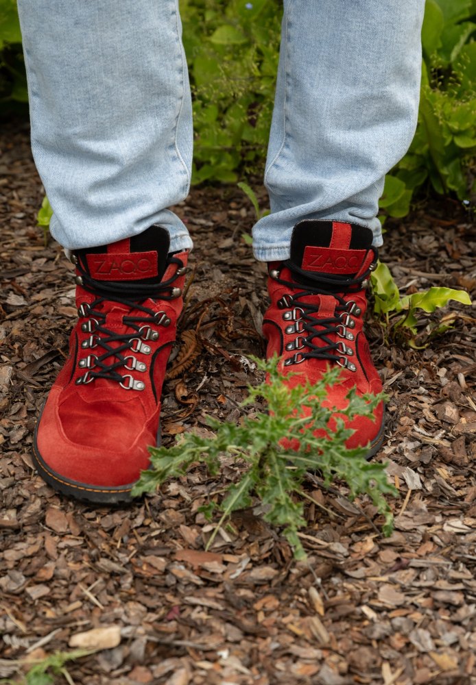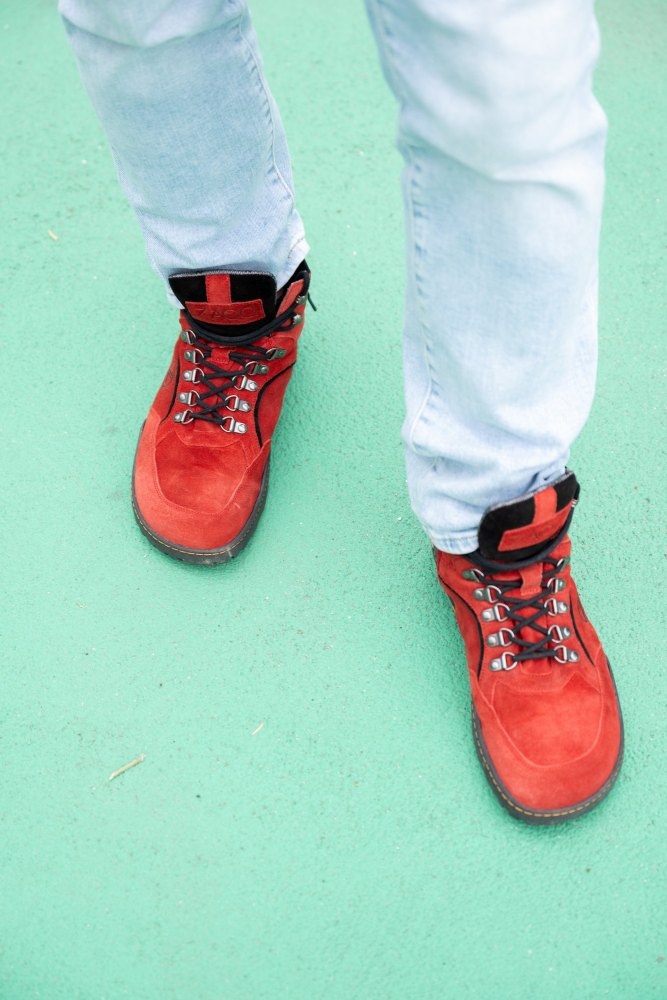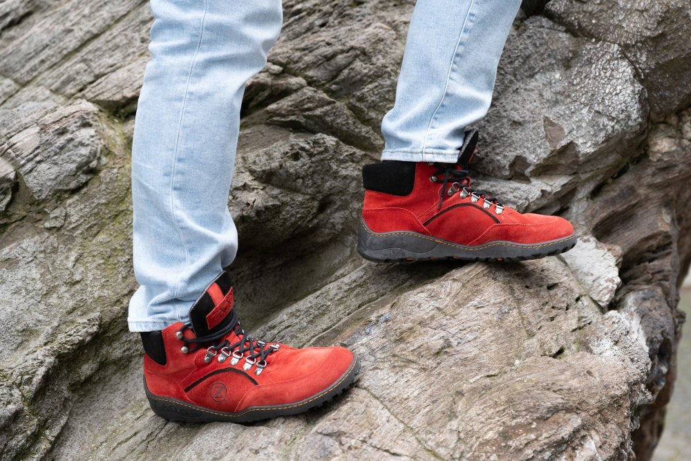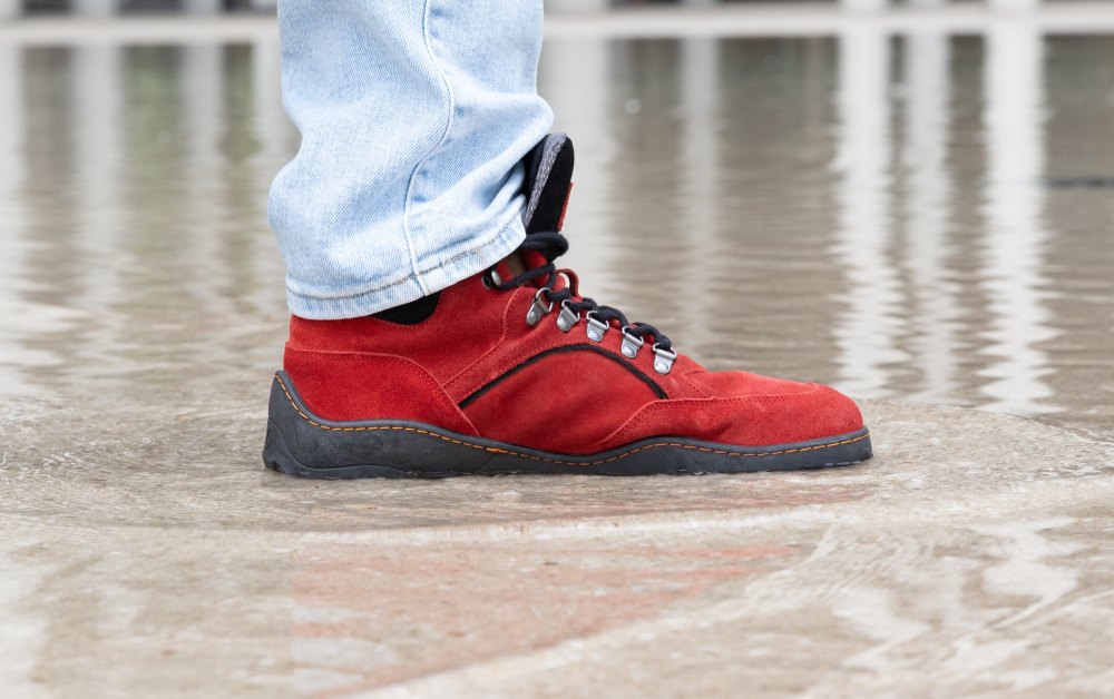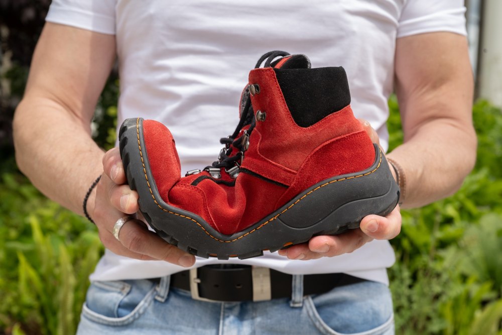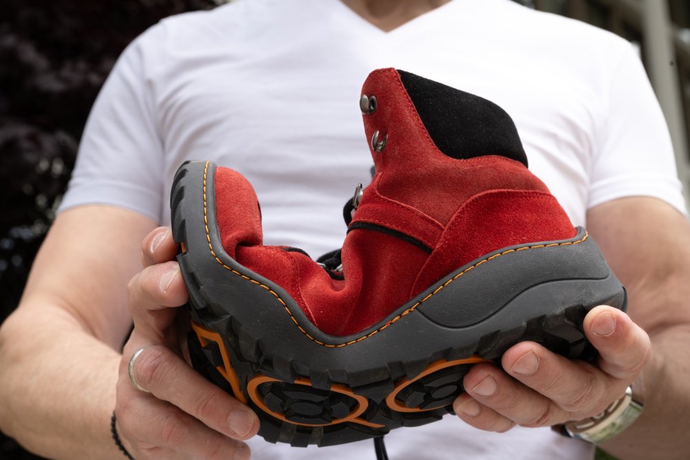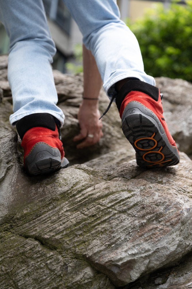 Den övre är gjord av mjuk mocka i en mörk orange ton. Robust från utsidan, underbart gosig och flexibel från insidan, en bekväm utomhussko måste vara.